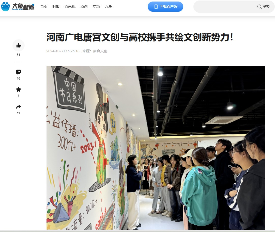 活动伊始,学生们来到了唐宫文创展厅深入了解了河南卫视中国节日系列,以及唐宫文创IP持续出圈背后的故事。唐宫文创致力于“用文化赋能产业,与世界共享生活美学”,在IP品牌联名、产品开发及销售、国风文化包装等方面不断构建新文化业态,拓展文旅文创产业链条。