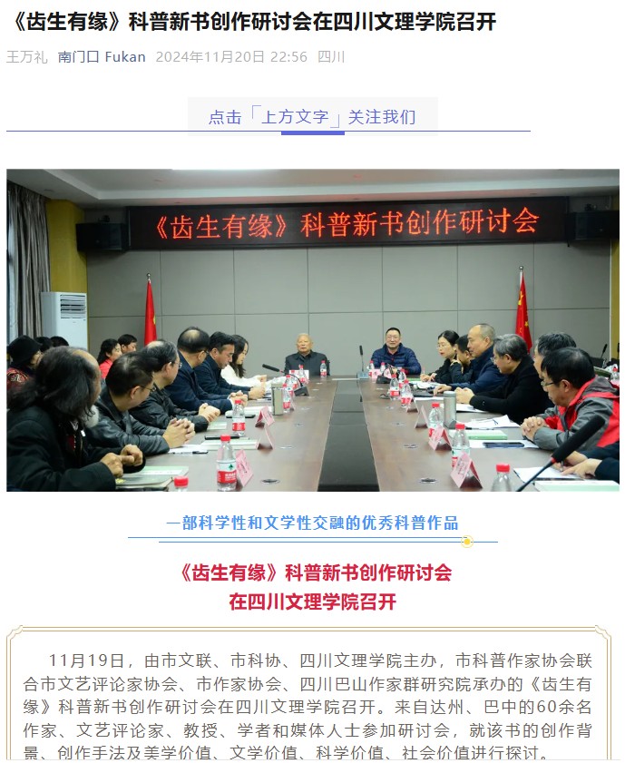 11月19日,由市文联、市科协、四川文理学院主办,市科普作家协会联合市文艺评论家协会、市作家协会、四川巴山作家群研究院承办的《齿生有缘》科普新书创作研讨会在四川文理学院召开。来自达州、巴中的60余名作家、文艺评论家、教授、学者和媒体人士参加研讨会,就该书的创作背景、创作手法及美学价值、文学价值、科学价值、社会价值进行探讨。