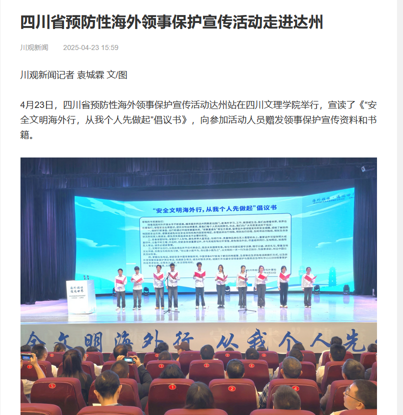 4月23日,四川省预防性海外领事保护宣传活动达州站在四川文理学院举行,宣读了《“安全文明海外行,从我个人先做起”倡议书》,向参加活动人员赠发领事保护宣传资料和书籍。