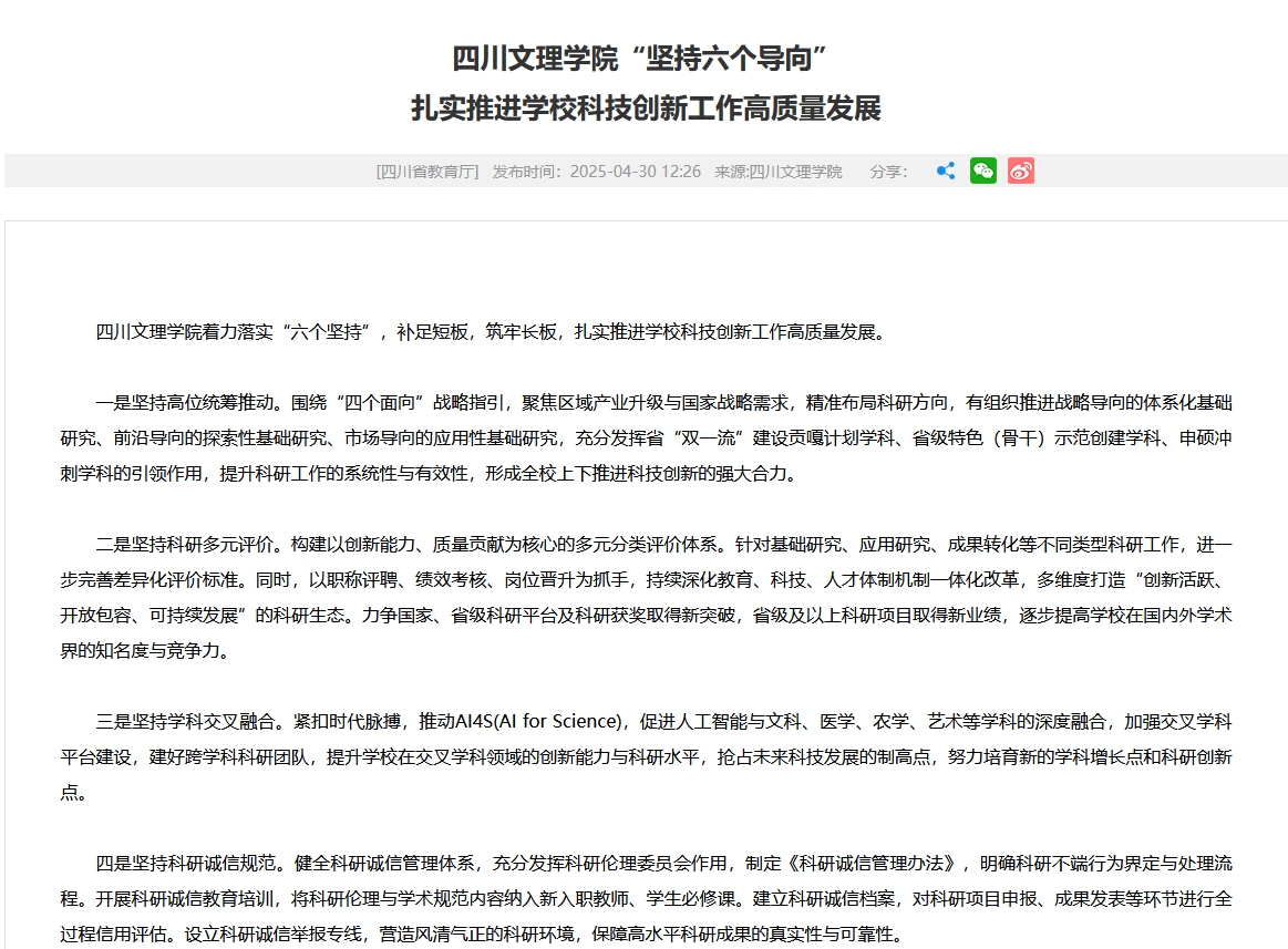 四川文理学院着力落实“六个坚持”,补足短板,筑牢长板,扎实推进学校科技创新工作高质量发展。