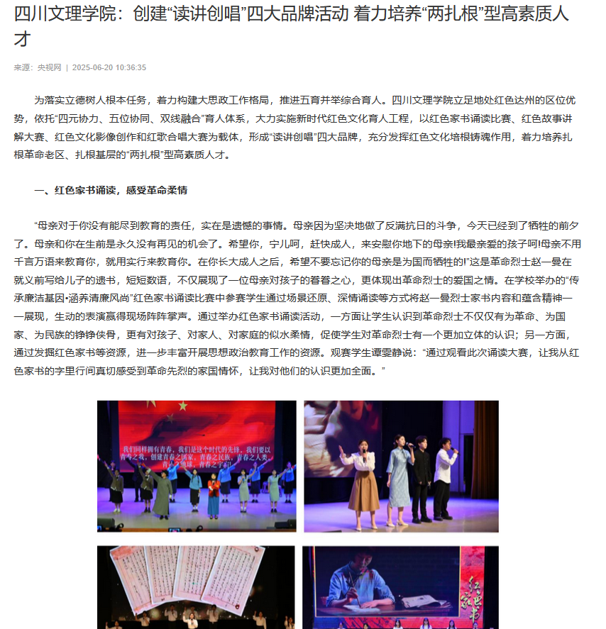 为落实立德树人根本任务,着力构建大思政工作格局,推进五育并举综合育人。四川文理学院立足地处红色达州的区位优势,依托“四元协力、五位协同、双线融合”育人体系,大力实施新时代红色文化育人工程,以红色家书诵读比赛、红色故事讲解大赛、红色文化影像创作和红歌合唱大赛为载体,形成“读讲创唱”四大品牌,充分发挥红色文化培根铸魂作用,着力培养扎根革命老区、扎根基层的“两扎根”型高素质人才。