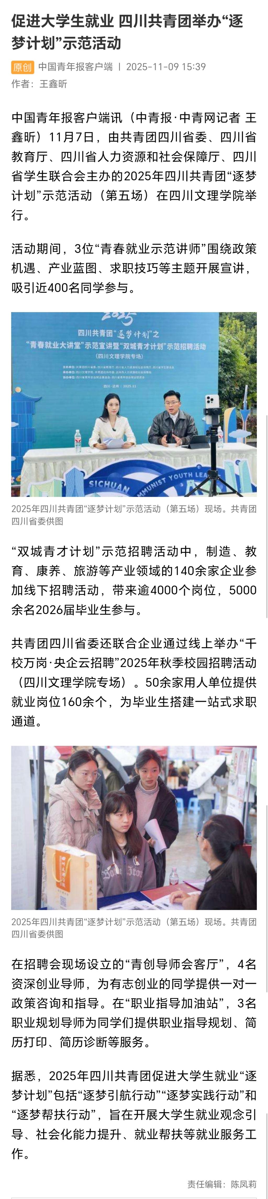 中国青年报客户端讯(中青报·中青网记者 王鑫昕)11月7日,由共青团四川省委、四川省教育厅、四川省人力资源和社会保障厅、四川省学生联合会主办的2025年四川共青团“逐梦计划”示范活动(第五场)在四川文理学院举行。
