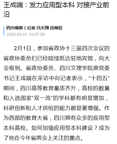 此外,他还建议,支持高校与龙头企业、产业园区共建现代产业学院、协同创新中心和实习实训基地,探索“订单式”“现代学徒制”等人才培养模式,推动四川应用型高等教育迈上新台阶,为新时代治蜀兴川提供坚实的人才和智力支持。