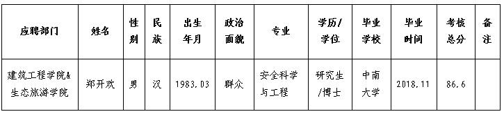 按照《四川文理学院高层次人才引进办法》,考核小组对应聘我校建筑工程学院&生态旅游学院郑开欢进行了考核。经学校研究,现将考核结果公示如下,公示期限为3个工作日(2019年4月10日至2019年4月12日)。公示期间接受社会监督和举报,举报者应以真实姓名书面或电话向四川文理学院人事处或纪委反映。 监督举报电话:0818-2790077、0818-2790019 邮箱:scwlrsc@126.com、jwjsc@sohu.com