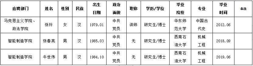 按照《四川文理学院高层次人才引进办法》,考核小组对应聘我校马克思主义学院、政法学院的张玲,智能制造学院的张春亮、牛世伟等3位博士进行了考核。经学校研究,现将考核结果公示如下,公示期限为3个工作日(2019年5月29日至2019年5月31日)。公示期间接受社会监督和举报,举报者应以真实姓名书面或电话向四川文理学院人事处或纪委反映。