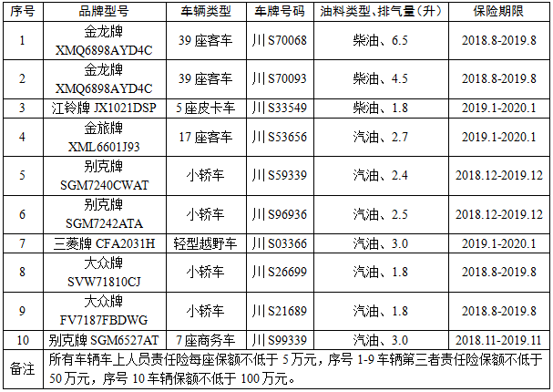 按照关于公务车辆管理有关文件要求,为确保公务车辆正常使用和行驶安全,现面向达州市选定四川文理学院办公室、保卫处、后勤处所属公务车辆保险受托保险公司。现将基本情况公告如下: