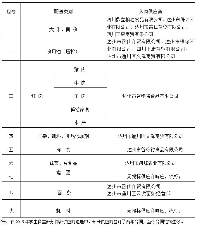 四川文理学院2017年学生食堂部分物资供应商遴选公告如下: 本招标共有9家供应商参与,通过核查投标供应商的资质情况,均为有效投标。根据本次招标的评标标准,确认我校2017年学生食堂部分物资供应商入围的单位如下: