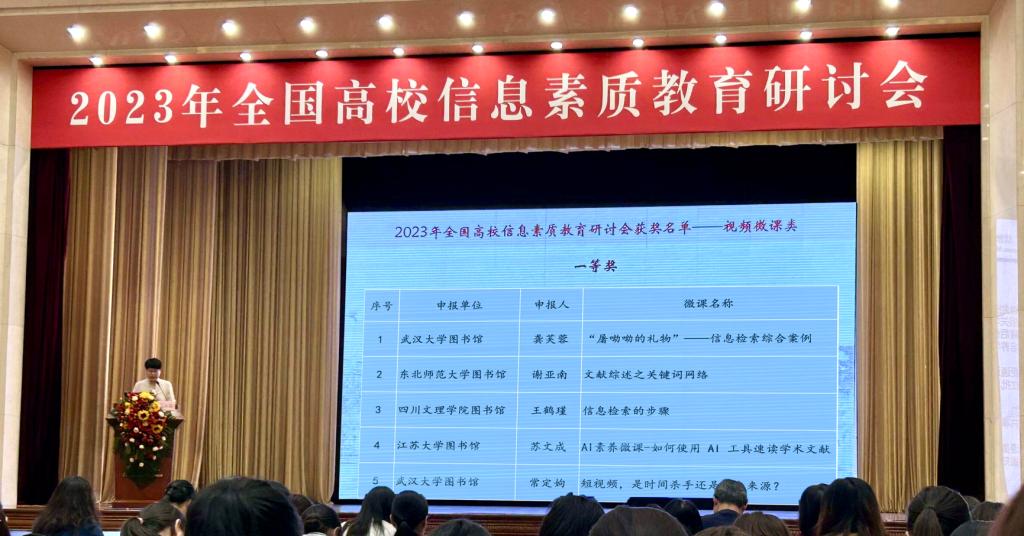 9月21日至23日,2023年全国高校信息素质教育研讨会在沈阳召开,我校图书馆青年教师郭碧玉、王鹤瑾参加研讨会,王鹤瑾老师获微课视频一等奖。