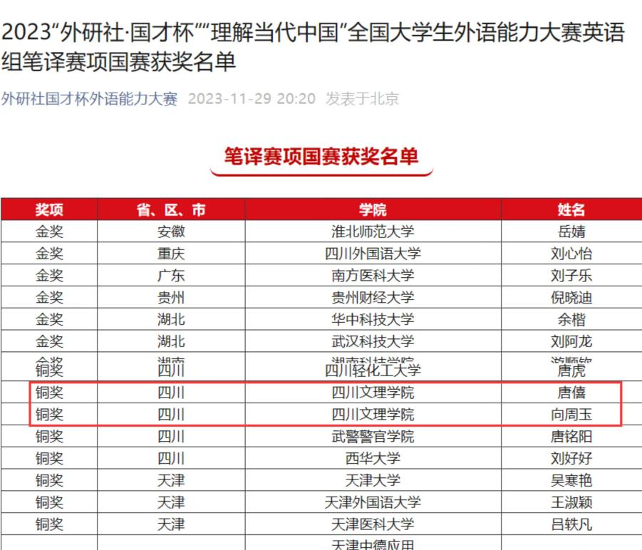 外国语学院2020级翻译专业的唐僖、向周玉同学进入了全国决赛,桂宙老师担任其指导老师。在经历了两小时的线上比赛后,两位同学最终代表四川文理学院获得笔译组全国决赛铜奖。