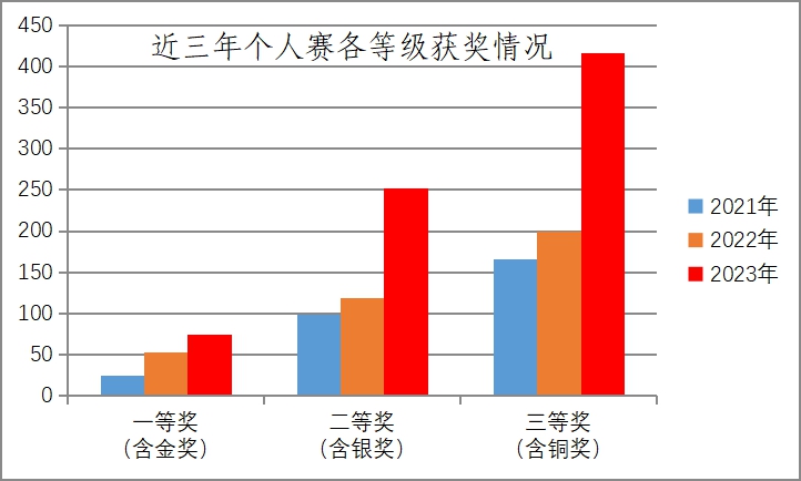 我校历来重视省级学科竞赛,在省级赛项参与上,实现了逐年递增。从个人赛获奖情况看,2023年一等奖比2022年增长了42%,二等奖、三等奖获奖数比2022年翻了一番;优秀指导教师人数更是翻了几番。
