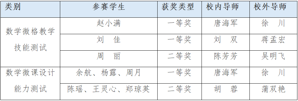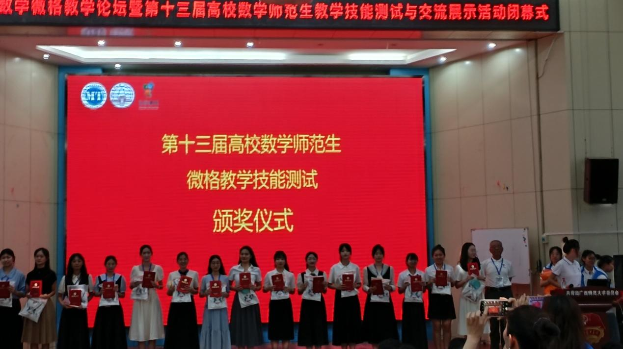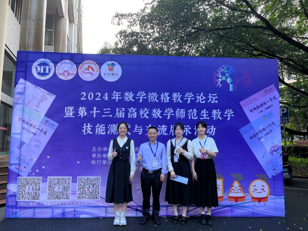 5月17日至20日,2024年数学微格教学论坛暨第十三届高校数学师范生教学技能竞赛与交流展示活动在广西师范大学落下帷幕,本次大赛由中国教育技术协会微格教学专业委员会主办、广西师范大学数学与统计学院承办,来自华中师范大学、陕西师范大学、西南大学、四川师范大学等在内的90所院校1611名选手参加比赛。我校数学学院学生通过初赛、决赛选拔,在数学专业教师和校外兼职导师的协力指导下,在微格教学技能竞赛中,荣获一等奖2项,二等奖1项;在微课设计能力测试中,荣获一等奖1项,二等奖1项。四川文理学院数学学院荣获优秀组织单位称号。