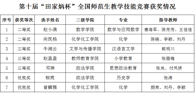 近日,第十届“田家炳杯”全国师范院校师范生教学技能竞赛结果公布,我校学生共获二等奖2项、三等奖3项、优胜奖2项。