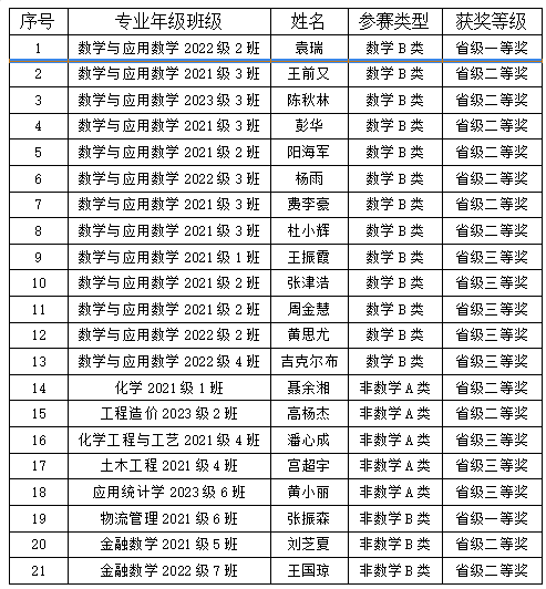 近日,由中国数学会主办的2024年第十六届全国大学生数学竞赛四川赛区比赛结果揭晓,四川赛区报名参赛人数1.3余万。我校21名学子在比赛中荣获佳绩,其中数学专业B类省级一等奖1人,省级二等奖7人,省级三等奖5人;非数学A类省级二等奖2人,省级三等奖3人,非数学B类省级一等奖1人,省级二等奖2人。