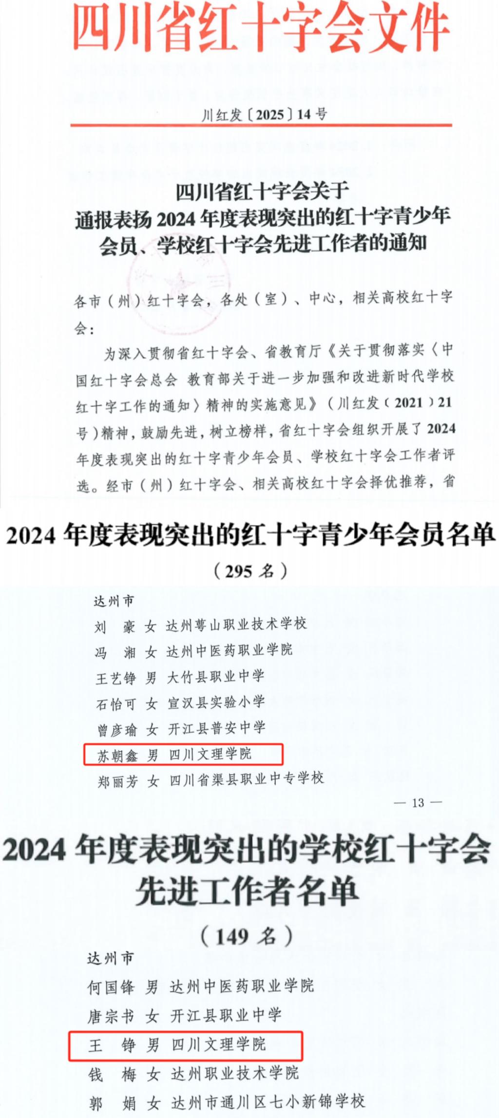 近日,四川省红十字会发布《关于通报表扬2024年度表现突出的红十字青少年会员、学校红十字会先进工作者的通知》,后勤服务处校医院王铮老师凭借在红十字工作中的突出贡献,荣获“2024年度表现突出的学校红十字会先进工作者”称号。该同志长期致力于红十字青少年工作,在应急救护培训、志愿服务组织等方面取得显著成效。同时,我校苏朝鑫同学以出色的公益实践荣获“2024年度表现突出的红十字青少年会员”称号,彰显了新时代文理学子的青春力量。