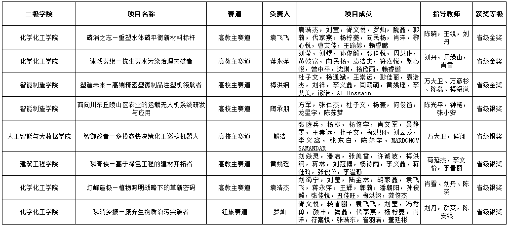 此外,我校“面向川东丘陵山区农业的运载无人机系统研发与应用”、“灯峰造极—植物照明战略下的革新密码”、“磷膏侠—基于绿色工程的建材开拓者”等5个项目获得省级银奖,创新创业学院教师万大卫荣获优秀指导教师。