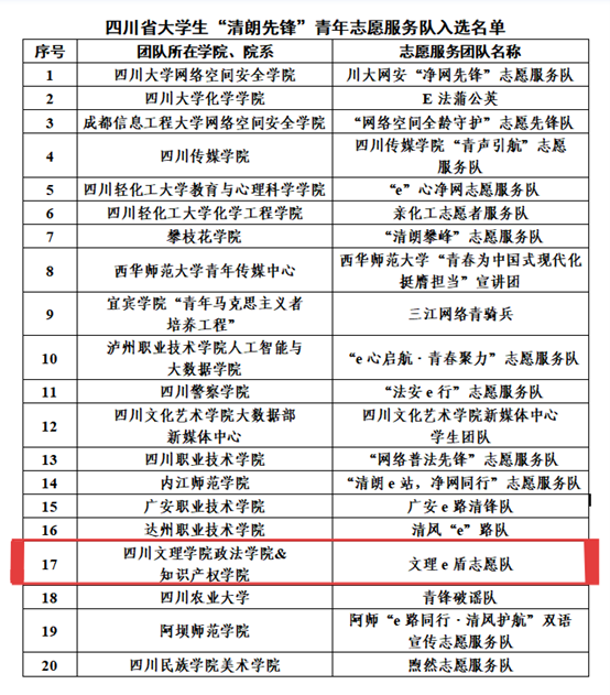 为深入学习贯彻习近平法治思想和习近平总书记关于网络强国的重要思想,深入宣传解读互联网法律法规,大力普及网络举报辟谣知识,提升青年学生对网络有害信息的辨识能力,中共四川省委网信办、共青团四川省委联合组织开展2025年在川高校大学生“e路同行 清风护航”青春志愿专项行动,面向在川高校大学生选拔招募20支四川省大学生“清朗先锋”青年志愿服务队。我校“文理e盾志愿队”脱颖而出,成功入选。