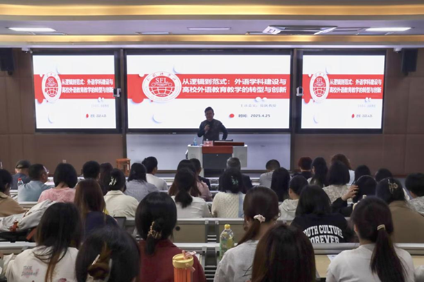4月25日下午,内江师范学院外国语学院院长徐跃教授为外国语学院师生带来题为《从逻辑到范式:外语学科建设与高校外语教育教学的转型与创新》的学术讲座。徐跃教授围绕四大核心维度对外语学科建设与高校外语教育教学的转型与创新进行阐释与分享。在讲座的互动环节,徐教授分别从高校微专业建设、AI技术在外语课堂教学中的应用以及四大核心维度在学院发展路径中的实践这几个方面回答了老师们的提问。